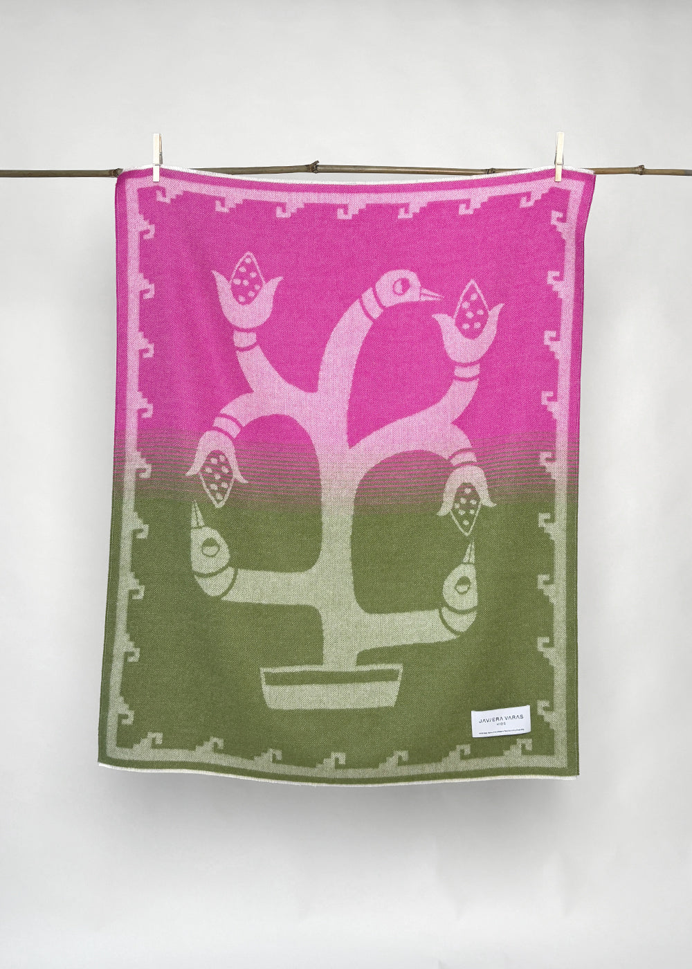 This blanket is inspired in pre-Columbian Andean imagery. Birds and corn are depicted together to signify a harmonious relationship between the earthly and spiritual realms, as well as the interconnectedness of nature, agriculture, and the divine.